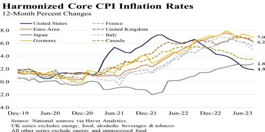 U.S. core CPI inflation (excluding food and energy) has declined significantly over the last 12 months (The U.S. Economy in Global Context, 2023). However, because various nations have varying rules for what goes into their inflation consumption baskets—most significantly, owners' equivalent rent—cross-country comparisons are rarely straightforward. High inflation has been a common occurrence in the majority of developed countries. Although inflation in the United States rose earlier than in other G7 economies—reflecting the brisk recovery from the pandemic—it also fell sooner and quicker (The U.S. Economy in Global Context, 2023). The Russian invasion of Ukraine caused significant increases in the price of food and energy, some of which trickled down to core inflation, accounting for a portion of the economic gap with respect to European economies. Despite this difficulty, these economies have recently displayed some encouraging tendencies for their short- and medium-term outlooks: hints of disinflation.