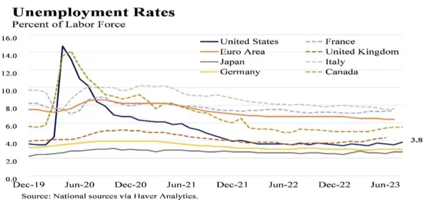 It can be particularly challenging to compare unemployment rates across economies due to variations in national labor laws. Nevertheless, the G7's unemployment figures during the COVID era differ significantly from one another. The United States and Canada experienced high spikes in their unemployment rates in April and May of 2020 and supported workers through supplemental unemployment insurance, while several European economies with workshare schemes saw declines in their unemployment rates (The U.S. Economy in Global Context, 2023). However, after the COVID shock the U.S. unemployment rate rapidly improved and has been consistently below 4 percent since January 2022 (The U.S. Economy in Global Context, 2023). Amid the most rapid monetary tightening cycle since the 1980s and an increasing labor force participation rate, the jobs market in the United States remains strong with a current unemployment rate of 3.8 percent (The U.S. Economy in Global Context, 2023)