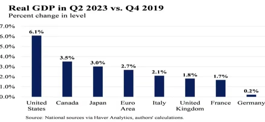 There has been significant variation in the pace and distribution of the global recovery across various nations. Even today, most advanced economies are below the trend growth path that they were on before the pandemic – except the United States, which is on track this year to return to reach the level that would have been predicted by the pre-pandemic trend (The U.S. Economy in Global Context, 2023). But given its quicker return to trend growth, the United States is the closest, real output is only 1.4% lower than if pre-pandemic trends persisted (The U.S. Economy in Global Context, 2023)